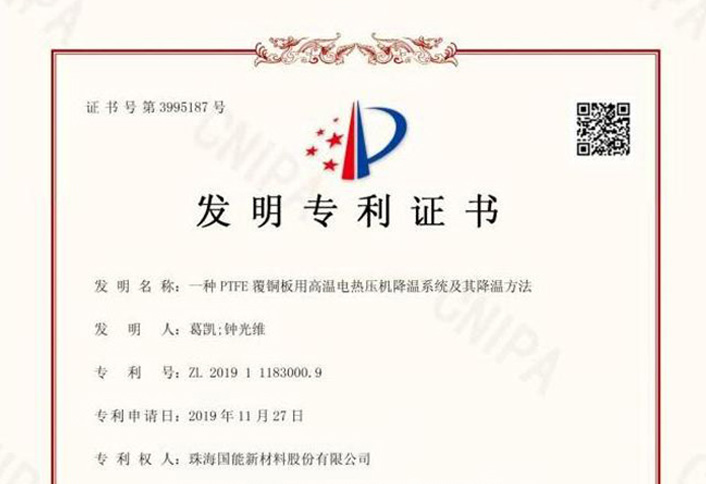 2020年9月18日,9728太阳集团获得由中华人民共和国国家知识产权局颁发、授权的《发明专利证书》。此项专利为公司本年度斩获的第三份专利发明授权。【发明简介】此次获得授权的发明名称为:一种PTFE覆铜板用高温电热压机降温系统及其...