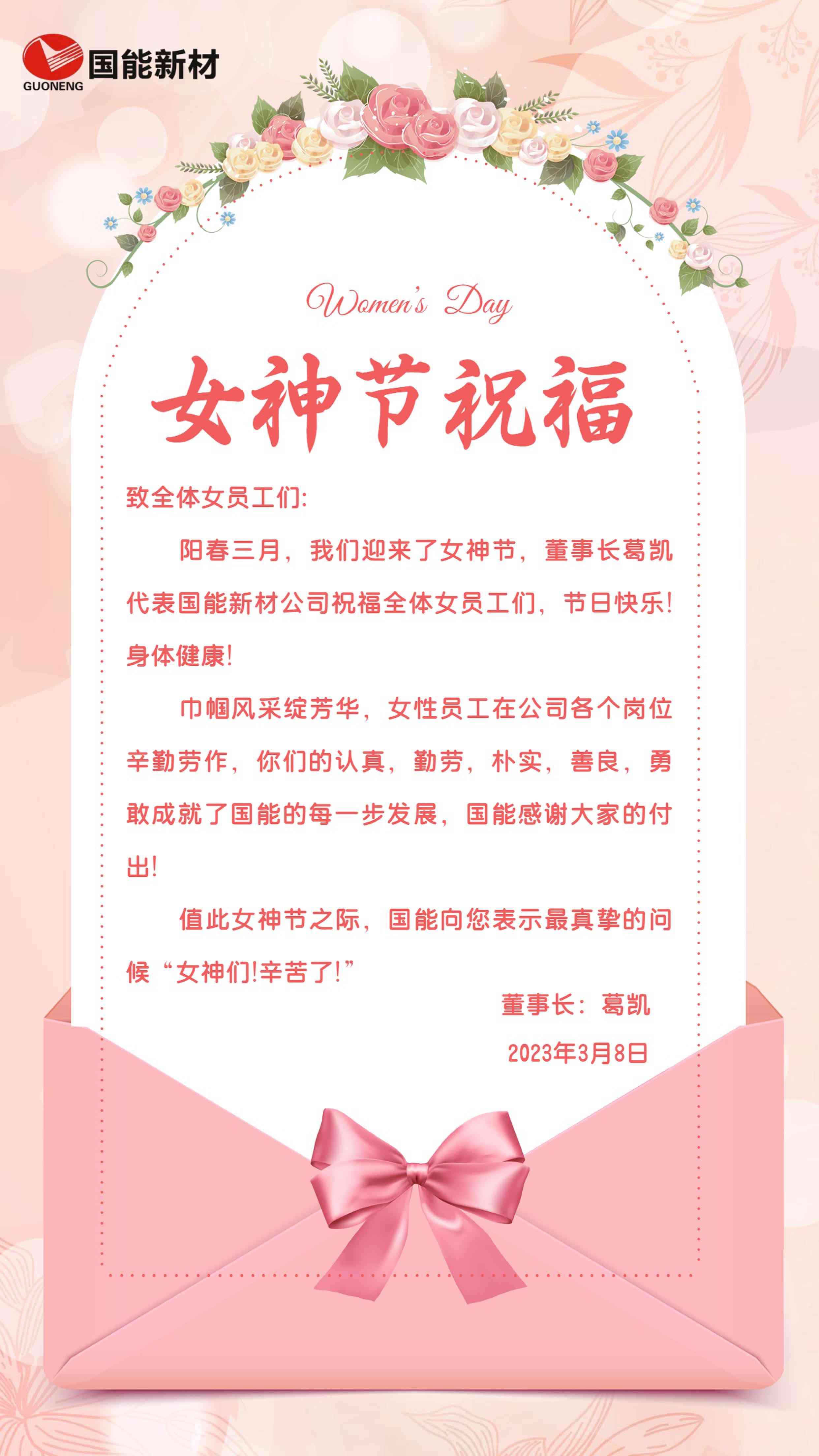 为庆祝三八国际妇女节,让全体女职工感受节日的温暖,国能新材董事长葛凯写了寄语向所有女职工致以节日的祝贺及问候。