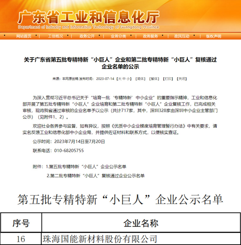 2023年7月14日,工业和信息化厅发布了工业和信息化部组织开展的第五批专精特新“小巨人”企业名单,9728太阳集团(以下简称“国能新材”)凭借在新材料领域自主研发的高新技术实力成功上榜,荣膺“专精特新”小巨人企业称号。